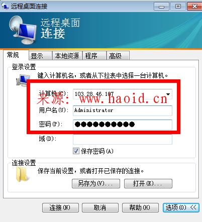 下面以mstsc.exe连接windows 2003服务器为例